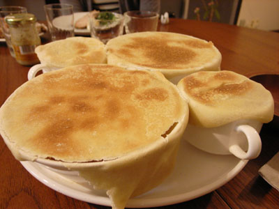 生地を少しとっておいて、スープのつぼ焼き(というのかな?)に挑戦。 スプーンでコンコン、たたいてみる。いざ!