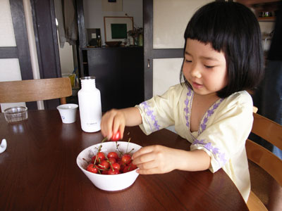 帰りにみんなでスーパーによって、何か果物が食べたいなあ、うーんさくらんぼにしようかな、どうかなおいしいかなあ、行ったり来たりしてとうとう買わずに帰ってくると ピンポーン、ゆうパックです、さくらんぼですよー。だって! たいてい買って帰ったときに届くのに! お母さんごちそうさま、どうもありがとう!