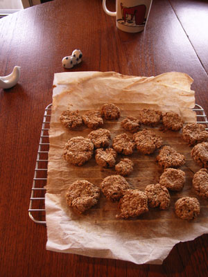 甜菜糖と塩を加え、なたね油と豆乳でまとめてクッキーをつくってみたら、、もうね、すごくおいしい!ふすま加減がオートミールクッキーみたいです。