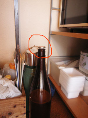 そしてこちらが一升瓶のふた、ほら、ちょっと浮いているでしょう。 一升瓶に詰めた梅ジュースがまだまだ発酵していて、数時間おきにぽーんっって栓を飛ばしているのです、おそろしや!