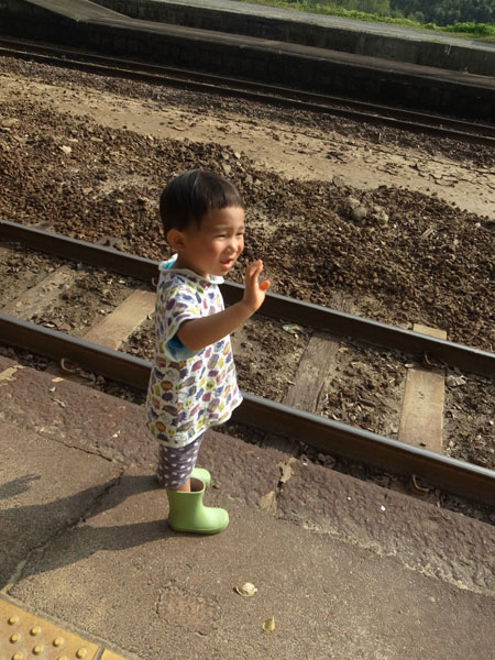 しょうくんと電車にのりました。(写真は近づいてくる電車に手をふっているところです)